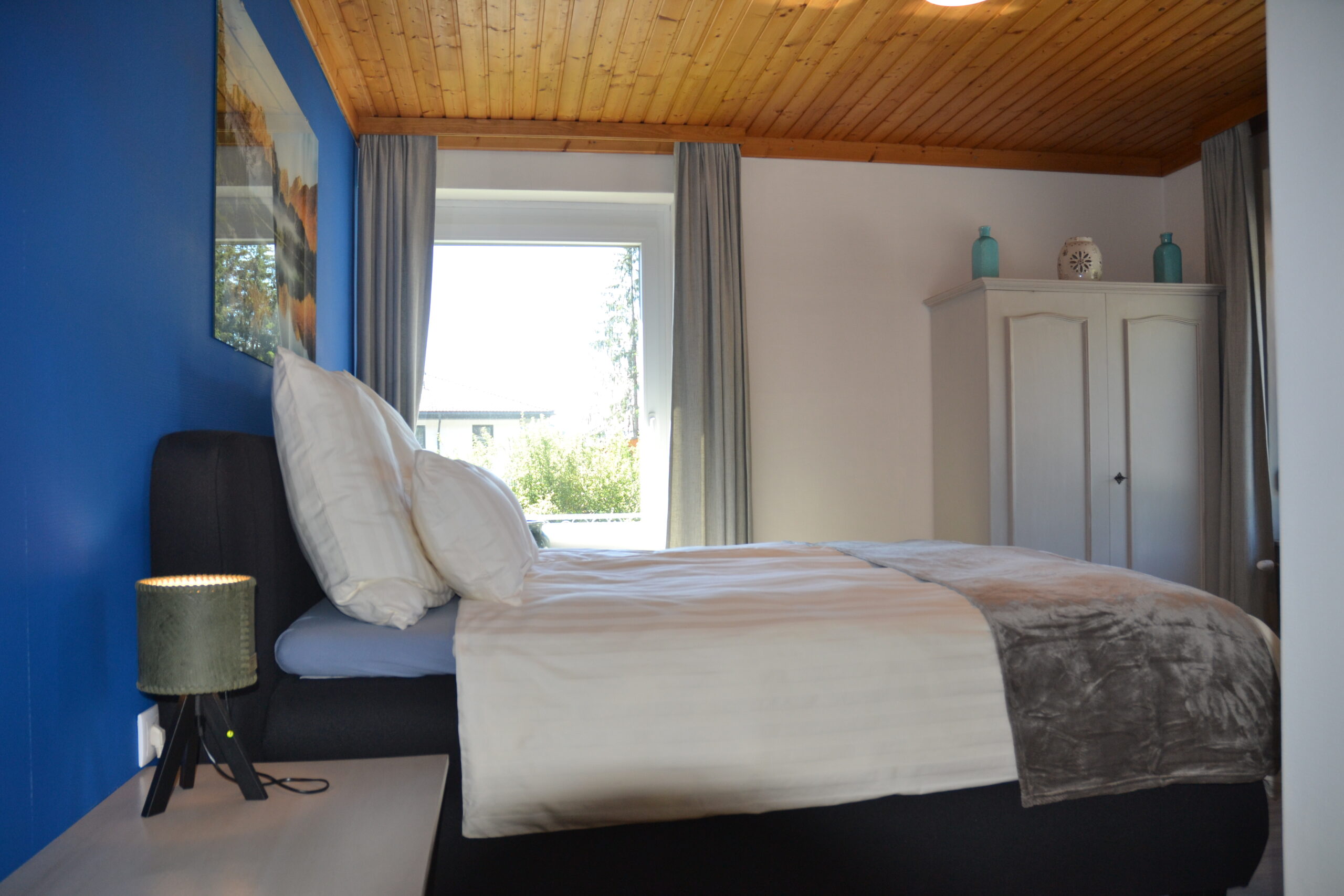 De moderne tweepersoonskamer straalt rust, comfort uit. Centraal in de ruimte staat een royaal tweepersoonsbed met een hoog, zacht gestoffeerd hoofdbord.