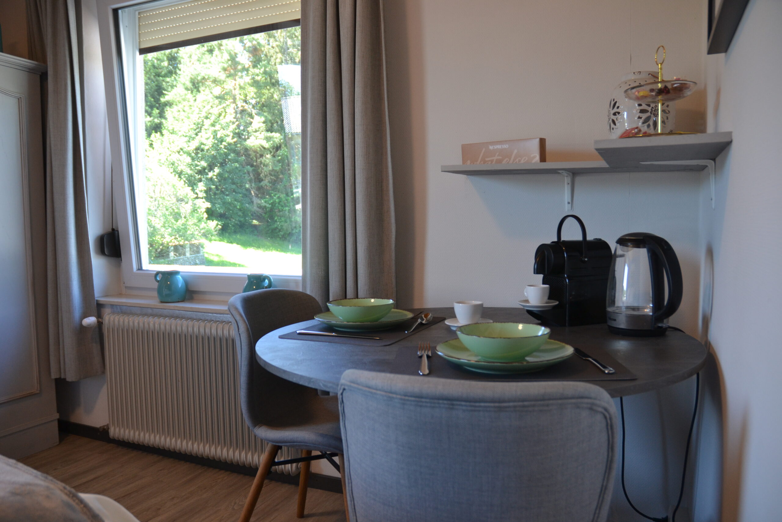 Tegenover het bed hangt een flatscreen aan de muur. Onder de tv staat een tafel met 2 warm gestoffeerde stoelen.